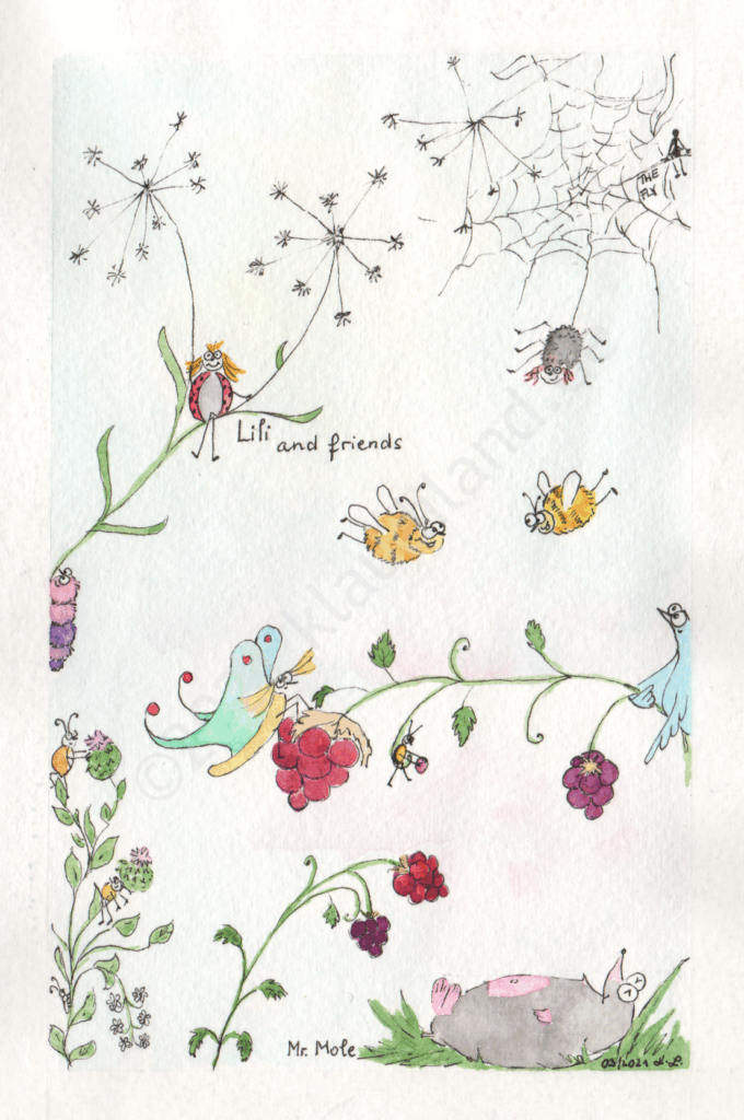 Meet Lili and her friends: Mr. Mole and The Fly. How many other creatures can you spot?